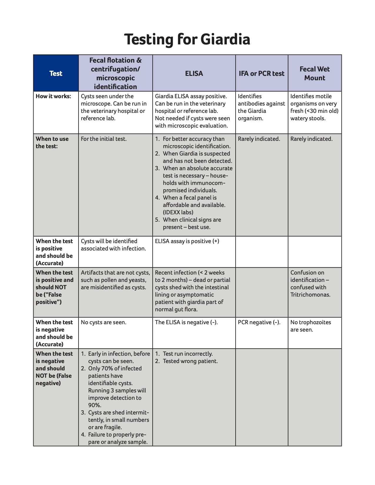 Giardia testing in dogs and cats may be done one to two days after the completion of therapy if the dog or cat still has abnormal stools. The recommended test to perform is a fecal flotation with centrifugation to detect cysts in solid or semisolid stools. ELISA tests may remain positive even after treatment for variable periods of time (one week to two months) and should not be used as a guide to determine reinfection or failure of treatment.